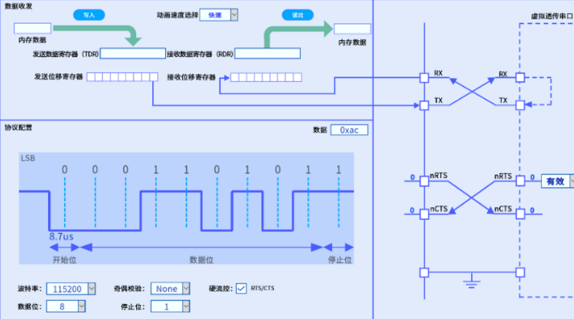 在虛擬仿真系統中,模擬了一個虛擬透傳串口,數據流向的基本過程為,UART控制器給虛擬透傳串口發送數據,然后透傳串口將接收到的數據,再發送給UART控制器,所以UART會接收到同樣的數據。點擊“寫入”,將內存中的數據寫入到發送數據寄存器(TDR)中,當數據從內存寫入到發送數據寄存器(TDR)之后,TDR中的數據會自動并行傳輸到發送位移寄存器中,然后數據會通過發送位移寄存器,按照LSB的方式將數據一位一位的從Tx引腳移出